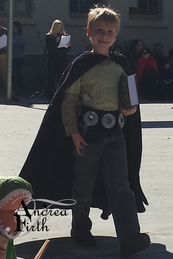 This year, I had plenty of notice that he wanted to go as Lief from Deltora Quest. He has been devouring the books, and just in the last few months has read all 3 series from start to finish. Quite an effort for a boy who isn't even 8 years old yet! Thankfully my husband had been borrowing the books from him and reading them too, so he was able to give me a pretty good idea of what we needed for the costume. The boys came home from a walk one day with seven giant gems to use in a belt, and we all went for a trip to Marrickville in search of some fabric for a cloak. We were after something dark, but not plain black, and when we came across this fabric we knew we'd found the perfect fabric. It's a black stretch fabric with sparkly threads all through it.